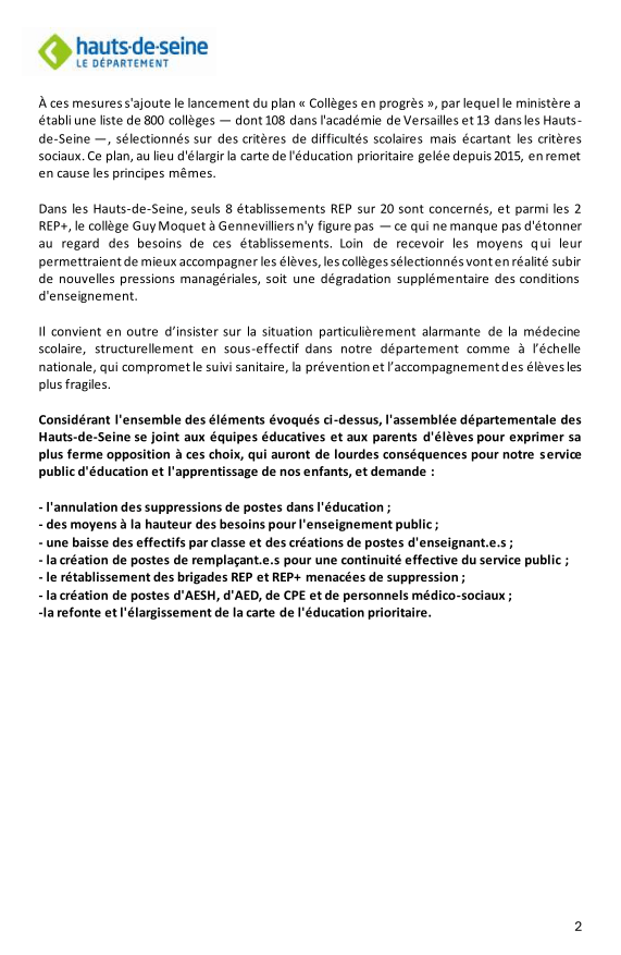 Considérant l’ensemble des éléments évoqués ci-dessus, l’assemblée départementale des Hauts-de-Seine se joint aux équipes éducatives et aux parents d’élèves pour exprimer sa plus ferme opposition à ces choix, qui auront de lourdes conséquences pour notre service public d’éducation et l’apprentissage de nos enfants, et demande :